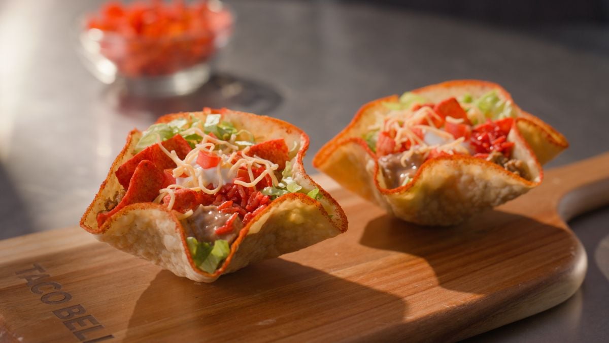 “Featuring seasoned beef, Fritos Flamin’ Hot corn chips, cheddar cheese, lettuce, tomatoes, and refried beans in a crispy, golden tortilla bowl rimmed with Flamin’ Hot seasoning.”